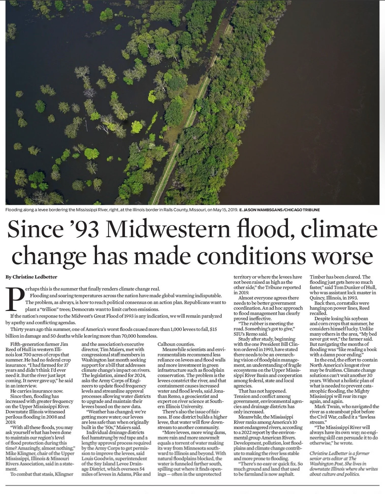 Opinion: The Midwestern flood of 1993 was devastating. Climate change has made conditions worse.“Flooding and soaring temperatures across the nation have made global warming indisputable.” — Published August 2, 2023, Chicago Tribune (Paywall)