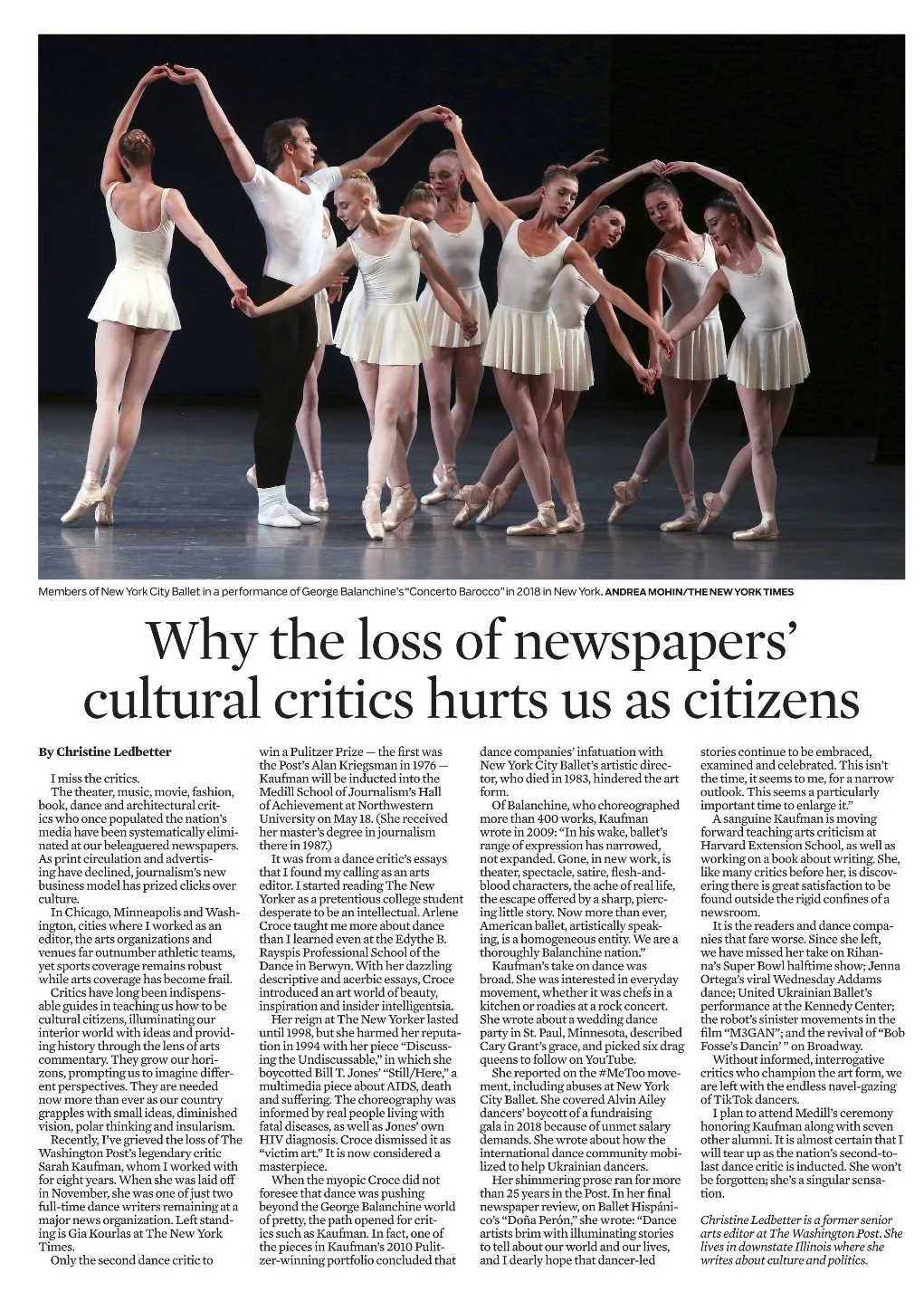 “The theater, music, movie, fashion, book, dance and architectural critics who once populated the nation's media have been systematically eliminated at our beleaguered newspapers. As print circulation and advertising have declined, journalism's new business model has prized clicks over culture.” – Published May 1, 2023, in the Chicago Tribune (Paywall)