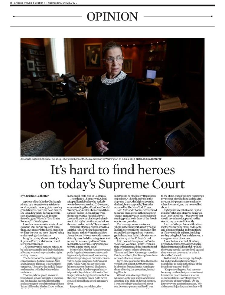 “Imagine having a hero on today’s Supreme Court, with its near record low approval ratings. The conservative justices’ refusal to be held accountable and their decisions affecting women’s reproductive rights are key reasons.” – Published in the Chicago Tribune, June 26, 2024 (No paywall)